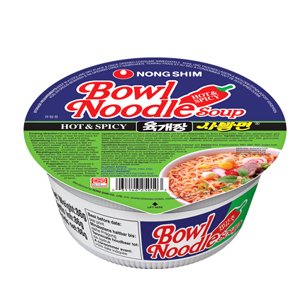 Pálivá korejská polévka v platsové misce. Množství nudlí vás zasytí a silná pálivá chuť chilli osvěží.