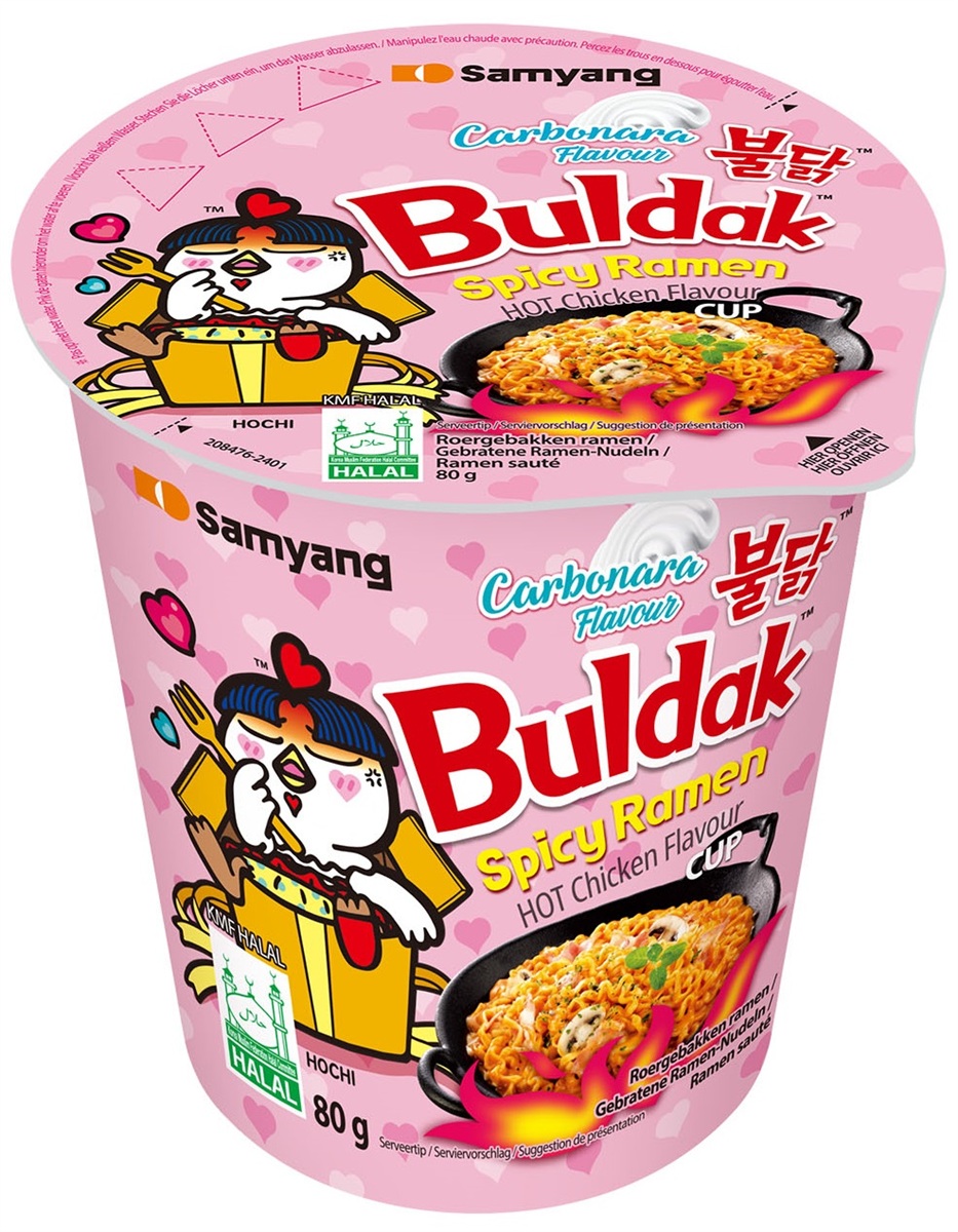 Instantní nudle Ramen značky Samyang. Varianta Buldak Hot Chicken Carbonara, tedy pálivé s kuřecí příchutí ve stylu Carbonara.
