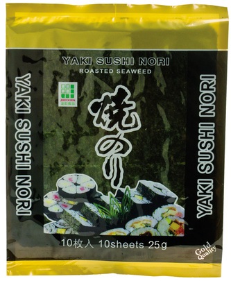 Sušená řasa nori stlačená do plátů pro přípravu sushi. V tomto balení je 10 listů, což postačuje pro přípravu 5 porcí sushi.