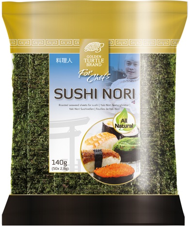 Sušená řasa nori stlačená do plátů pro přípravu sushi. V tomto balení je 50 listů, což postačuje pro přípravu 25 porcí sushi.